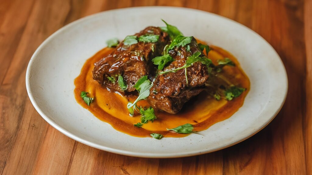 Indulge in incredibly tender, fall-off-the-bone short ribs bathed in a rich, deeply flavored red wine…
